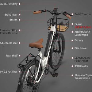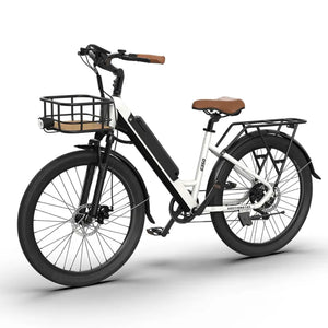 The G350 is an elegant and versatile bike with a white outlook, headlights, 20*2.1 narrow tires, front fork shocks, and a W5-LCD display. The Low step-through Frame design is friendly to the elderly and women, providing convenience and superior comfort. The sturdy aluminum rear rack is perfect for taking your adorable pet for a ride or taking your adorable kid to school.