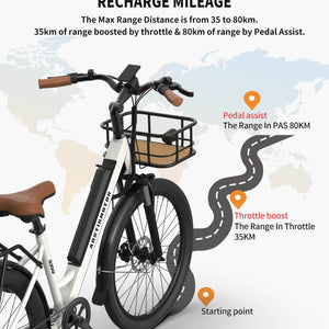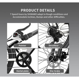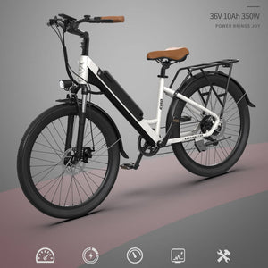 Our light city electric bike G350 is equipped with a 36V 10AH lithium battery and 350W motor power. It takes 4-6 hours to charge and can ride 25-35 kilometers. The Lightweight Aluminum Alloy Frame and puncture-resistant tires provide incredible stability. The responsive braking system with the front 180 and rear 160mm disc rotors provides sufficient stopping power even in the harshest conditions. The Shimano 7-speed shifter is designed for your riding experience, allowing you to change gears as needed to suit different terrains.