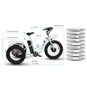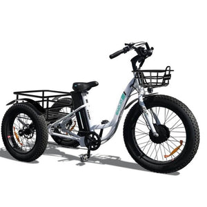 A stable and heavy-duty electric trike that features a front suspension fork, suspension seat post, capable and comfortable fat tires, and a front and rear basket.