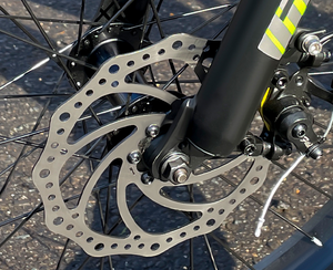 Effortless performance is at your fingertips with the Shimano 7-speed gear system, allowing you to seamlessly switch gears for optimal efficiency, whether you're ascending steep slopes or gliding along flats. The 180mm disc brakes provide reliable stopping power, ensuring a safe and controlled ride. Experience comfort like never before with the shock absorber, smoothing out bumps in the road for a plush and enjoyable riding experience.