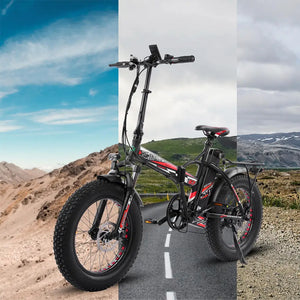 The Ecotric 20" 500W Fat Tire Portable Folding Electric Bike with LCD Display folding fat e-bike is popular with commuters and city riders.  The upgraded shock-absorbing front fork, combined with the comfortable but compact 20" x 4" tires offers the most comfortable ride yet.