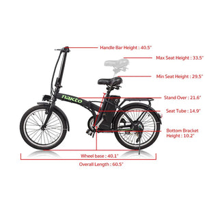 The Nakto folding electric bicycle measures 60.5 inches in length and 42 inches in height, with a seat height of 20 inches to 29 inches. The folded bike measures 33” inches long and only 26 inches high, so it fits inside most car trunks. The bike comes with a battery, a charger, a mini-tool kit, and a user manual.