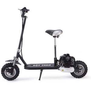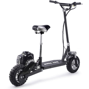 The MotoTec 49cc Gas Scooter is the ultimate kid ride! Great for driveway and parking lot fun, cruise around cones and speed through trails with ease. Comes standard with front & rear disc brakes, 11-inch knobby pneumatic dirt tires, front & rear shock and a removable seat.